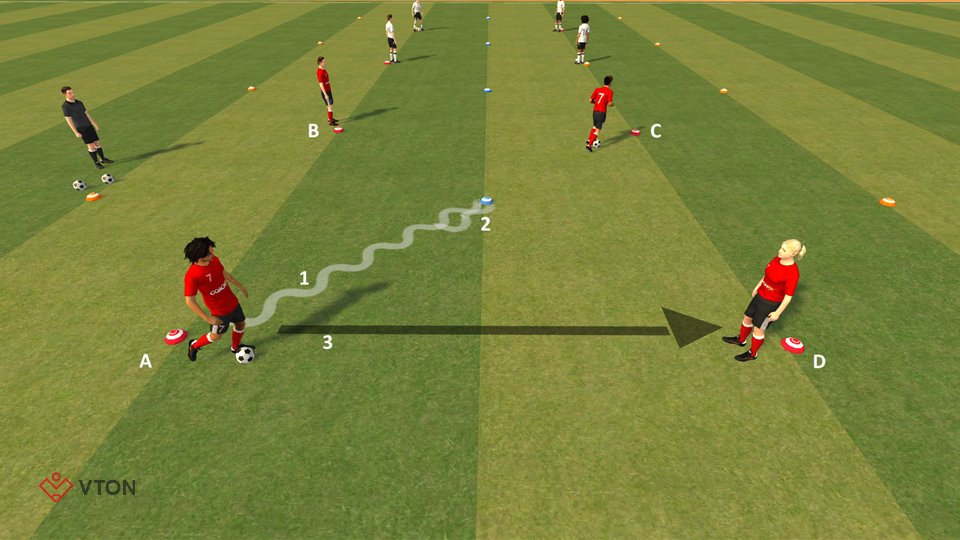 - A en C dribbelen naar de pion in het midden.