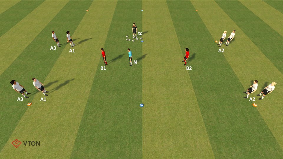 - Wanneer A2 zijn bereikt, proberen zij weer de bal te krijgen bij de blauwe nummers A3.